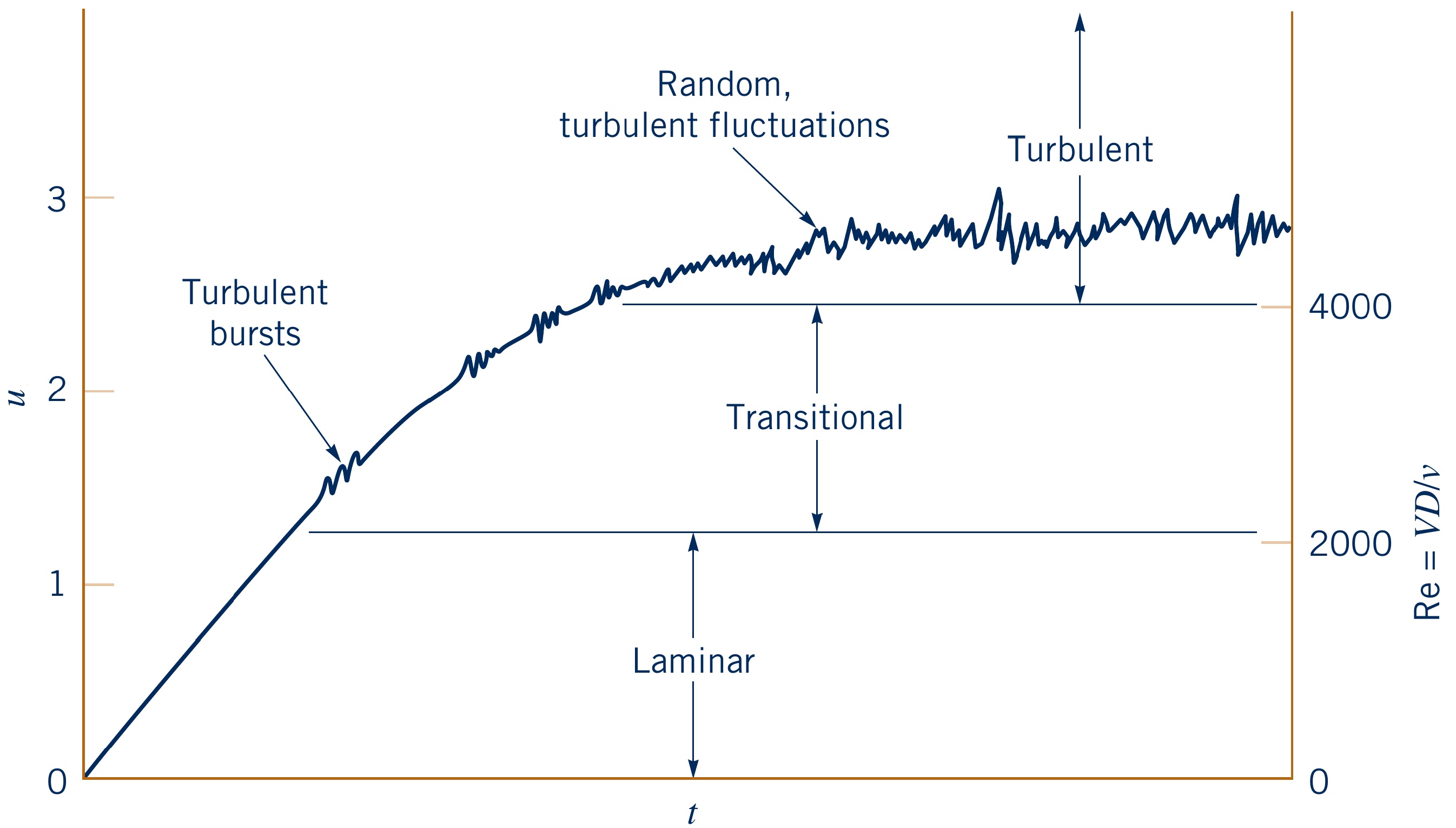 Happens gradually between $Re \approx 2100$ and $Re \approx 4000$