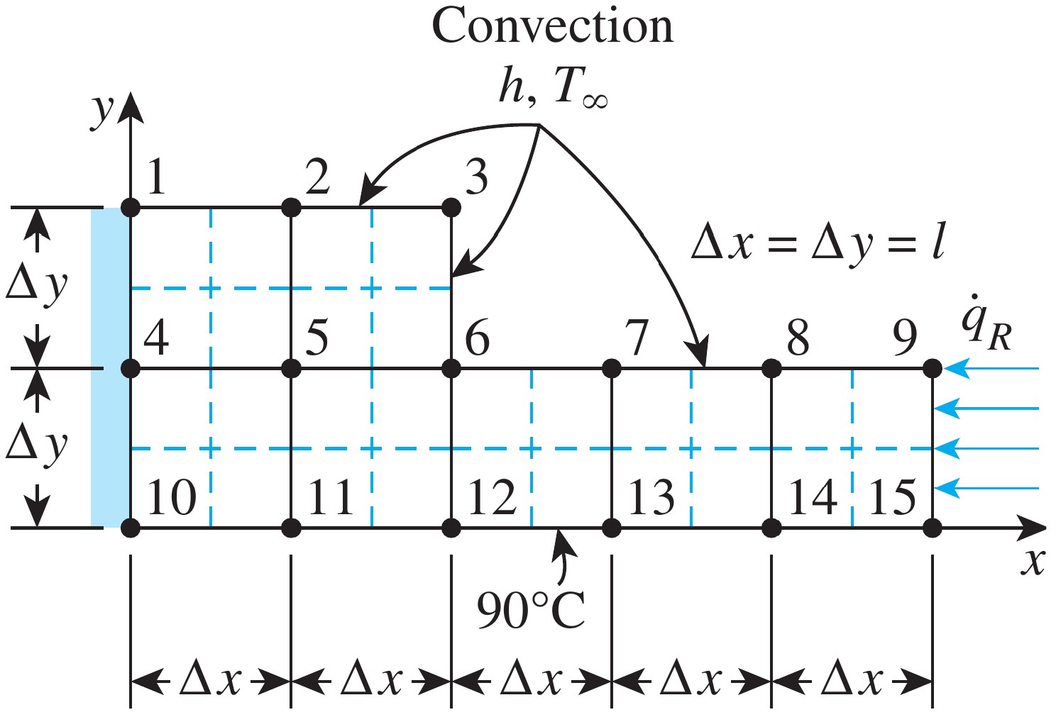 Determine the temperature at the 15 nodes. Thermal conductivity is $k = 15$ W/m·K, and heat is generated in the body at a rate of $\dot{q} = 2 \times 10^6$ W/m³. The left surface of the body is insulated, and the bottom surface is maintained at a uniform temperature of $90^\circ \text{C}$. The entire top surface is subjected to convection to ambient air at $T_\infty = 25^\circ \text{C}$ with a convection coefficient of $h = 80$ W/m²·K, and the right surface is subjected to heat flux at a uniform rate of $\dot{q}_R = 5000$ W/m². The nodal network of the problem consists of 15 equally spaced nodes with $\Delta x = \Delta y = 1.2$ cm.