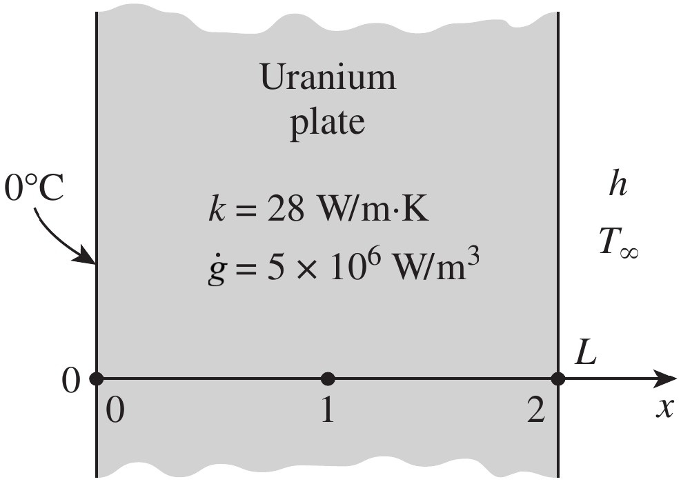 $\dot{g}=5\cdot 10^6$ W/m³. The left side is maintained at 0°C and the right