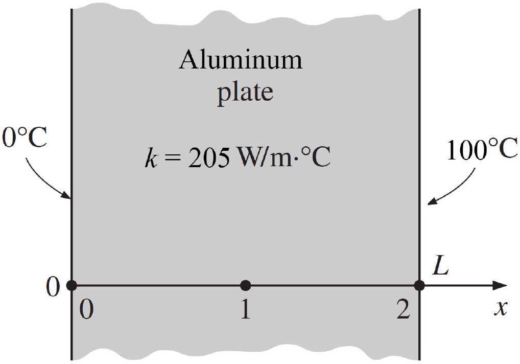 Consider a aluminium plate of length $L=0.5$ cm and thermal conductivity $k=205$ W/(m·K) in which no heat is generated ($\dot{g}=0$). One side of the plate is maintained at 0 °C by icy water while the other is maintained at 100 °C. Estimate the temperature in the centre at node 1.